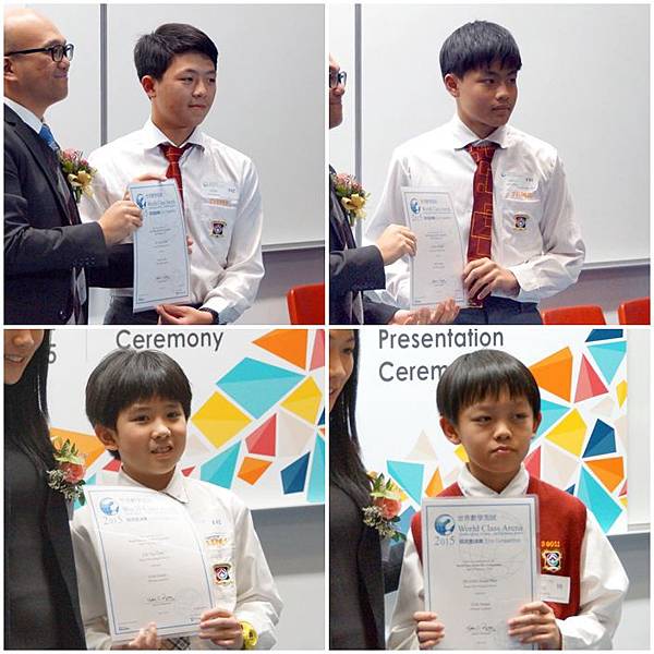 2015年「世界數學測試」精英邀請賽現已圓滿結束。本屆精英邀請賽總共有570名來自國內、香港、澳門及台灣之同學參加,其中147人獲得金獎。而台灣地區金獎得主獲大會邀請出席於3月7日(星期六)假香港科技大學舉行之頒獎典禮。這次獲獎的同學正是小學部六年級黃冠維、五年級劉宇晨、九年級林靖軒、陳威宇。獲得這項肯定,真的令人相當雀躍。