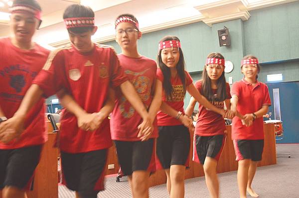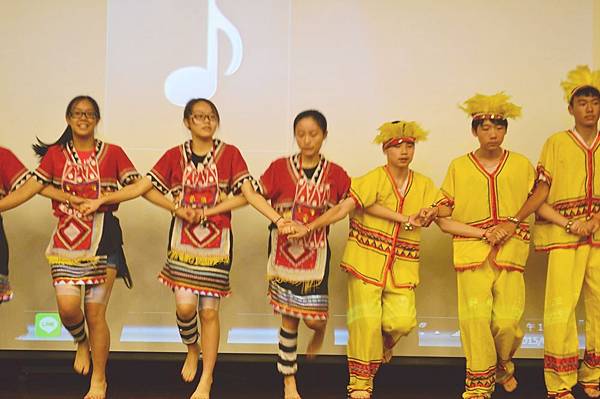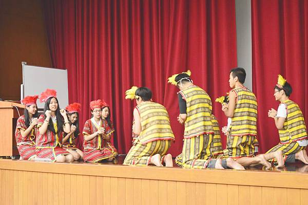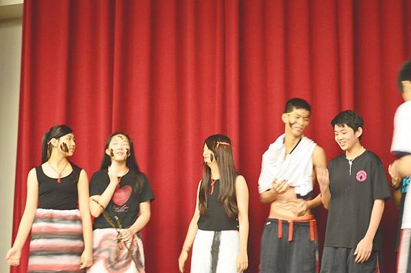 學校為八年級的孩子們規畫了一連串的「原住民文化的多元課程」就在前幾天完成了整個八年級同學們的表演課程。八年級劉聖德老師說。「孩子們真的很用心,小組間分工合作,除了找資料,確認資料的正確性,再將所負責的族群主題展現出來。」同學們在台上盡情地唱頌著原住民在祭典活動的歌曲,赤腳並圍成圓圈跳著舞。情緒,有時嚴肅、有時歡樂。八年級同學們在這一堂課程裡,必須初步理解原住民非文字的傳播方式,排灣族、魯凱族、雅美族的雕刻,泰雅族、卑南族、阿美族的編織、服飾,以及其他種種諸如黥面、紋身等表現,無一不承擔著原住民傳統社會的傳播責任。這些無聲的語言,配合言說、樂舞的傳統,生動有效地「書寫」了早期原住民的主體世界。