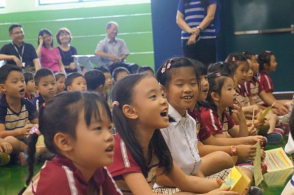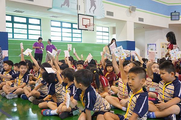 入學會場上,二年級的學長姐們也準備了小禮物要送給學弟妹們。之前在上學期,學校舉辦了小一初體驗課程,就是由當時還是一年級的學長姐們帶領著大家一起來體驗,因此在新學期的開始,學長姐們也將帶領大家一起來適應這不同的學習環境,所以每位學長姐們都準備了一張寫著滿滿祝福的卡片,親手念出來及交給學弟妹們,並透過一個個給予信心的擁抱,讓學弟妹們有信心及勇氣來迎接未來的學習挑戰。二年四班 宜恩學姐說:「今天,要特別歡迎一年級的學弟、學妹,想告訴你們在這裡上學非常有趣,不但學到豐富的知識,下課時還有很多地方可以玩,尤其是童趣廣場和活力廣場,和到圖書館看書,還能集點換禮物呢!小學有太多、太多好玩和有趣的事情,說也說不完,如果你有需要幫忙的地方,別忘了來找我們喔!」「我有看到長長的溜滑梯喔~」「你等下跟我一起去玩好不好?」學弟妹們在台下呼應討論著。