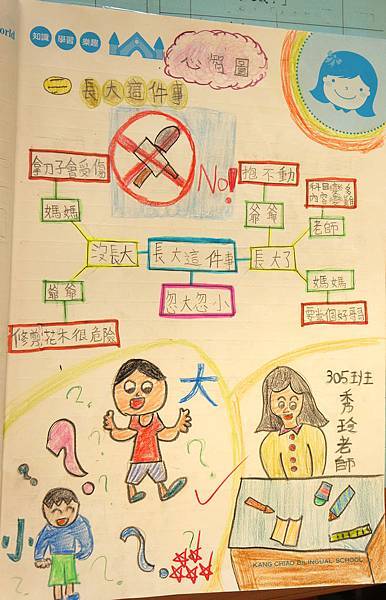 三年級的孩子在文字書寫的掌握度上還沒有高年級的孩子成熟,在理解的能力上還需要透過各式的引導,所以我們先讓孩子觀察課文,理解課文中作者與不同人物互動的反應與想法,並且透過師生討論共同完成課文架構圖,在孩子的筆記中,我們可以看到大家用心畫出的課文架構心智圖,雖然有著各式各樣的形式,但都呈現出大家對於課本的理解程度,知道長大就是一種變化,每個人都會有各種不同的變化,而且能夠掌握詞語寫出完整的句子。 理解了『原來長大會帶來各種變化』後,再透過合作學習,一起討論長大的各種內外在變化,並把大家所講的記錄下來。在細細聆聽孩子的討論、靜靜觀察孩子的筆記時,驚豔地發現透過老師引導,各組的合作與分享,在經過自我的內化,三年級的孩子已經與低年級不同,可以思考出課文中所講及所未講的深沉涵意,並且已經能慢慢做出了屬於自己的筆記模式,看著孩子們一筆筆所寫下的字句及模式,深深覺得孩子真的慢慢長大了。