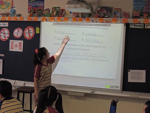 看著同學們專注討論課文的樣子,大家除了學習到書本上的知識外,也學到了互助合作、集體創作及尊重、聆聽他人意見的學習態度,而在小組討論結束之後,孩子們會上台分享討論成果,台下的同學則會針對發表小組的內容提出意見或是疑問,在大家相互交流激盪之下,吸取他人的觀點,修正自己的方向,老師則會從旁協助指導,確保同學思考方向沒有偏離。