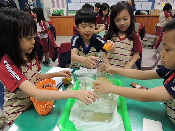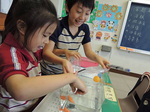 「老師,我們這組的積木是沈下去的,但是他們那組的卻是浮起來的。」孩子們主動發現了問題,也試著找出答案。「老師你看,我們把積木直直的放下去,結果它就沈下去了。」「老師,我們是橫著慢慢放,積木是浮起來的。」從自己動手做實驗當中,孩子們了解到放入水中時物體接觸水面的面積和放入時的速度,也是影響物品是否能浮起來的原因。