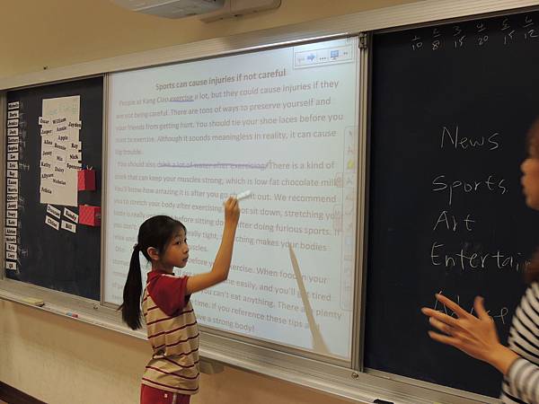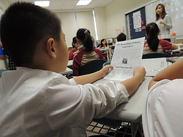 在這堂英文課,老師拿出五年級校園小記者採訪製作出的校刊,請四年級的同學看一看這裡面包含了哪些內容的報導呢?「News」、「Sports」、「Art」、「Entertainment」、「Advise」,同學找出了五種不同種類的報導文章,接著老師選出其中一篇文章做示範,讓同學閱讀後一起討論其標題以及主要內容。回歸課本,這一課上的是「How to Start a School Newspaper」,從課文延伸到孩子的校園生活,再從手中的校刊去發覺課文中所對應的文章類型。是的,要成為校園記者的第一歩,先要知道你採訪的內容是屬於哪種性質的新聞。
