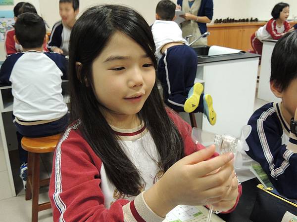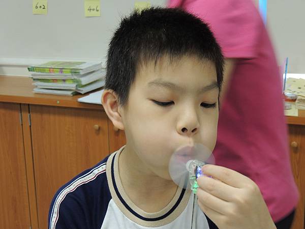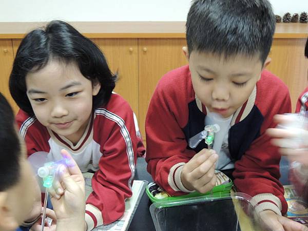 沒錯,風扇在轉動後產生了電,但是要如何讓燈泡能夠持續的發亮呢?老師發下小風車請兩人為一小組,互相研究討論。並且將親身實驗後的方法寫在小白板上。