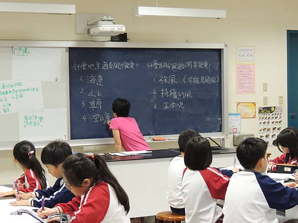 最後,老師要同學們自己想想看,如果你可以決定一個風力發電廠設立的地點;你想把它設在怎麼樣的地方?「苗栗的海邊」、「新竹的空曠之處」…。在經過了之前的討論和觀念的釐清,以及讓孩子們親手做實驗之後,大家對於風力發電都有正確的思考方向。