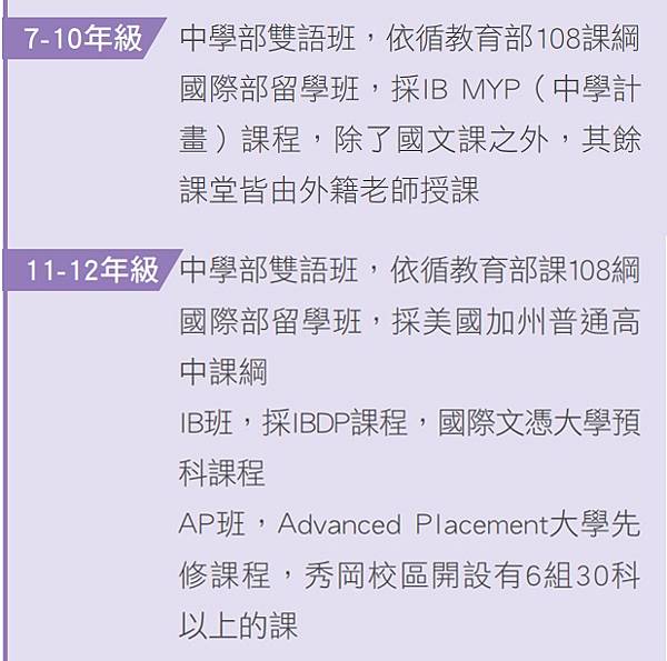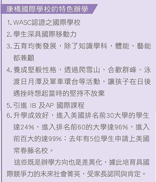 國際教育如何進行呢?徐文淞直指培養「國際意識、國際視野」,康橋的雙語班採台灣課綱以國內升學為主,同步採取國外課綱的英語課程,不僅強化英文能力,也融入多元文化的學習;留學班則以留學為目標,引進IB和AP等國際課程,讓準備出國的學生即早適應國外教育的方式,留學時可快速適應,同時也訓練學生未來如何獨立生活,多方面為留學生活做預備。