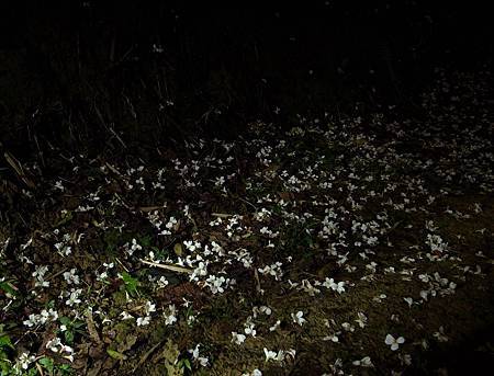 步道兩旁滿是掉落的桐花,