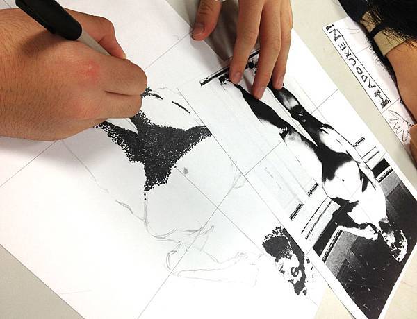 Lisa老師特別說明:這是我第一次嘗試讓學生用麥克筆,創作黑白的點描作品。作品展出後,大家都對學生的表現感到驚訝。我想這樣的練習,能讓學生專注在光影的變化,對於素描概念的建立也很有幫助。