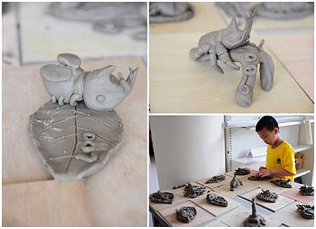 捏塑獨角仙最具挑戰的部分,就是巨大的頭角和細長和六隻腳。這些部分在接合要以泥漿,加強黏著,偶爾孩子忘了塗泥漿,就會看見四處飛散的小腳。