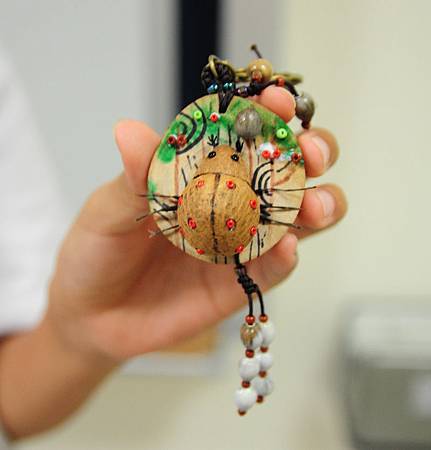 我們以樟樹樹幹作為基底,用檳榔種子當瓢蟲的頭部和身體,再點綴上彩色琉璃珠。