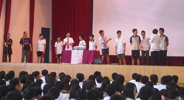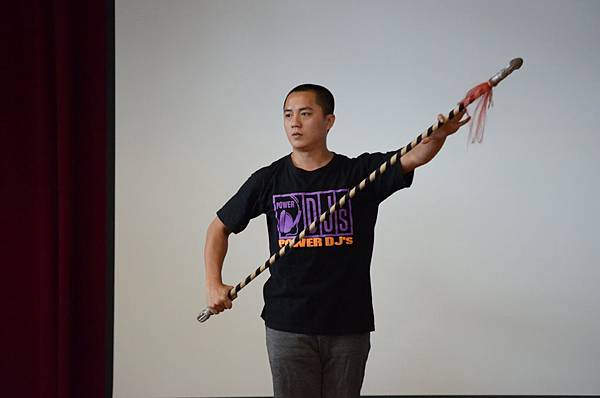 唐老師分享學習語言、練身段、練嗓子都不是一朝一夕可以達成,並請到兩位非常厲害的老師「單雙手耍花槍、亮相、拋水袖」。當她問到有沒有人現場要體驗看看啊?康橋的學生真的是非常熱情、主動、積極,一下子將近二十個學生衝上台去,把握機會練習呢!