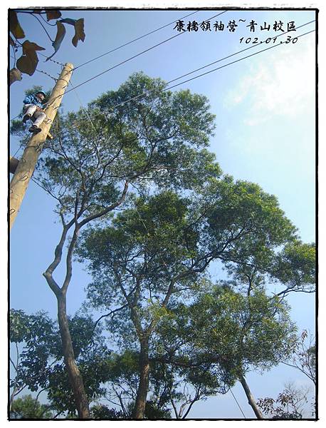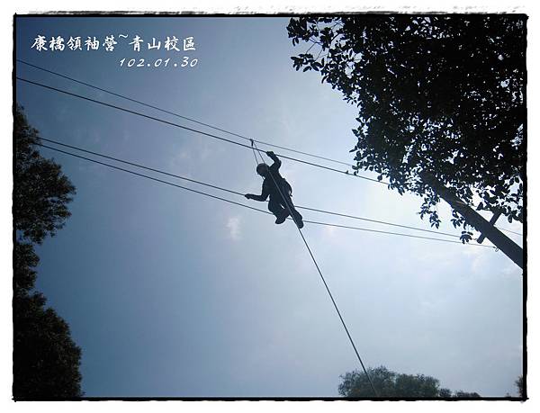 康橋領袖營探索營隊在青山校區高低空場地【勇氣山丘】上課,現場有「大擺盪、雙索吊橋、高空獨木橋、蔓藤路、交叉索、天空步道、之字梯、垂降、蜈蚣梯、空中之島、普魯式攀登與攀樹、三索吊橋、大溜索、低空獨木橋、賞鯨船」等十五項(我不敢玩的)設施。